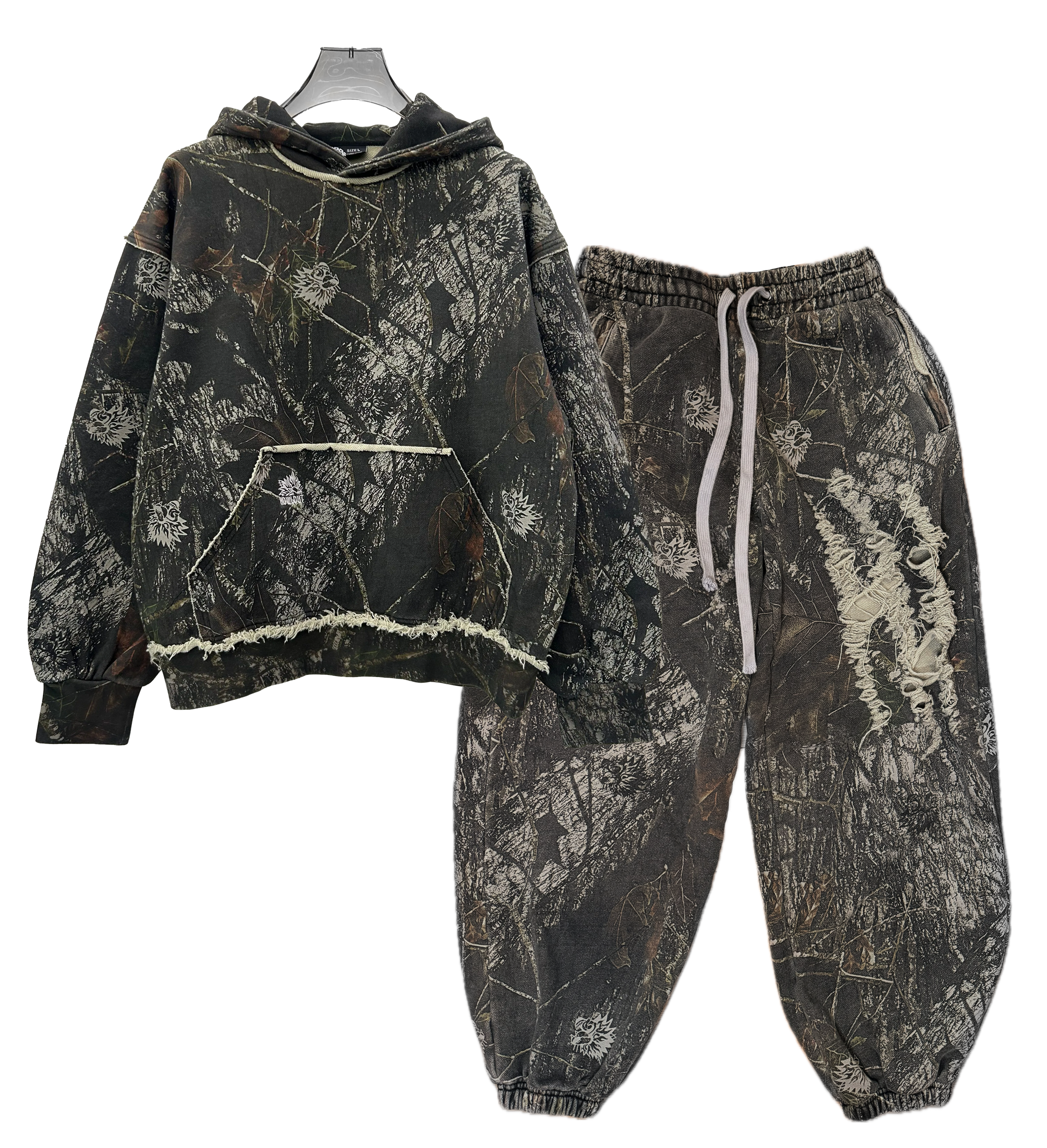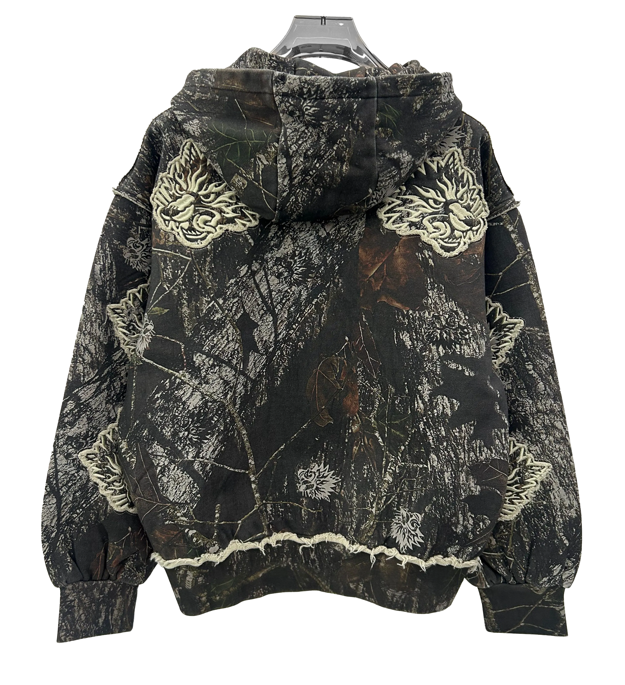 Hoodie info: This custom camo features 6 embroidered wolves on the back sleeves, with a rugged distress look complimenting the entire hoodie. The hoodie is an oversized look, but fits more true to size. Made of a heavy, soft fleece, this hoodie is comfortable in winter and spring weather. Measurements in hoodie section of size guide. Model is wearing a large.